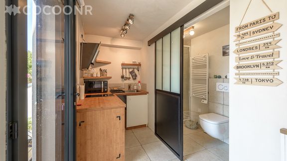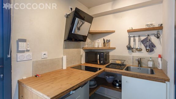 - Une cuisine ouverte équipée : plaque de cuisson (double), hotte aspirante, frigo, cafetière et micro-onde
