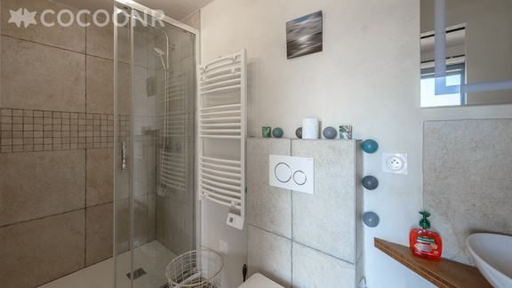 - Une salle de bain avec douche à l'italienne, WC suspendu et sèche serviette