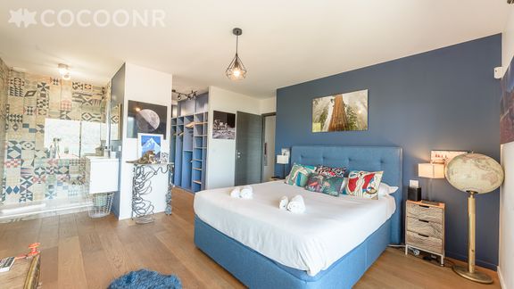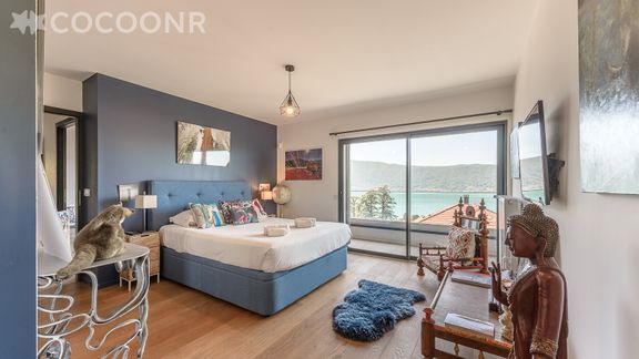 - Chambre 2 : suite parentale avec lit queen-size (160x200 cm), salle de douche attenante, vasque, grand dressing et accès balcon vue lac.