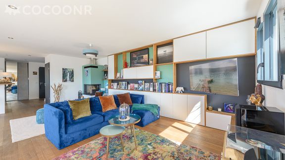- Salon lumineux avec canapé d’angle, TV connectée (Free), chaîne hi-fi, bibliothèque et cheminée.