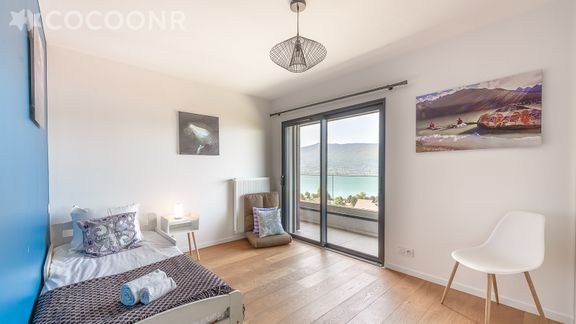 - Chambre 4 : un lit simple, grand placard et balcon offrant une vue panoramique sur le lac.
