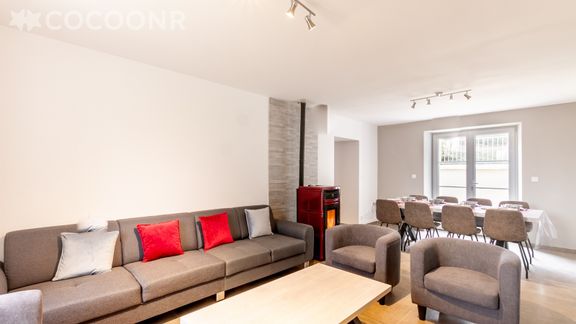 - Un salon et séjour avec poêle à granulés, canapé, fauteuils et TV