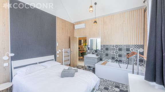 - Chambre 1 : Un lit double (140×190) avec baignoire