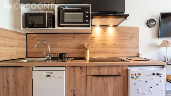 - Une cuisine équipée avec notamment : bouilloire électrique, four, four à micro-ondes, grille-pain, lave-vaisselle, plaques de cuisson...