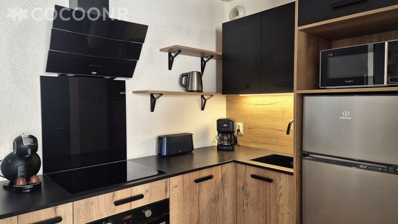 - Une cuisine ouverte équipée avec notamment : four, micro-ondes, plaque à induction, hotte, réfrigérateur/congélateur, lave-vaisselle, bouilloire électrique, grille-pain, service à raclette/pierrade, service à fondue, gaufrier, cafetière filtre et machine à café Dolce Gusto...