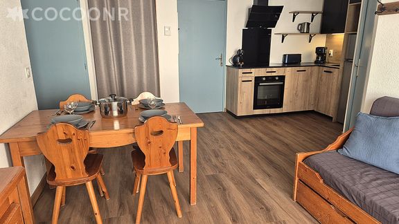 - Une pièce de vie de 18 m² avec TV canapé-lit double et espace repas.