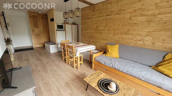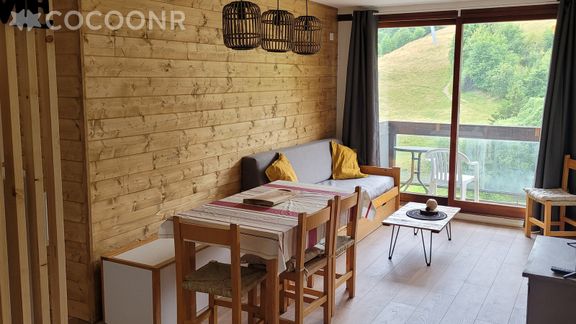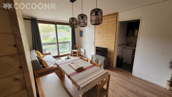 - Un espace séjour/salle à manger de 21 m² bénéficiant d'un balcon exposé sud donnant sur les pistes de 46 m² avec banquette lit gigogne et TV.