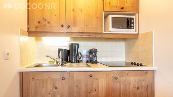- Une cuisine ouverte équipée avec notamment : bouilloire électrique, four à micro-ondes, grille-pain, lave-vaisselle, plaques de cuisson, machine à café à dosette Tassimo...
