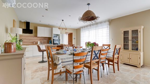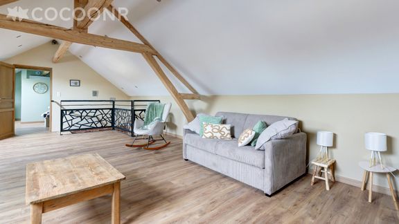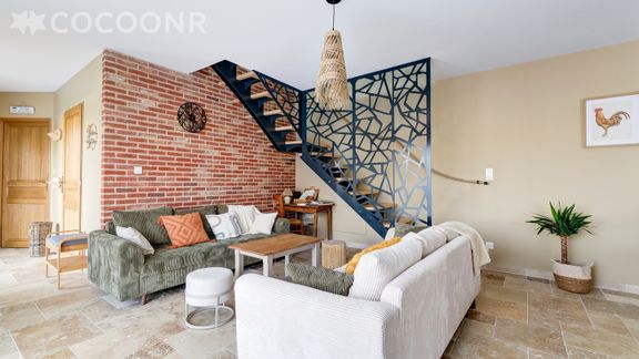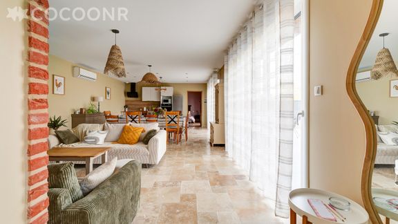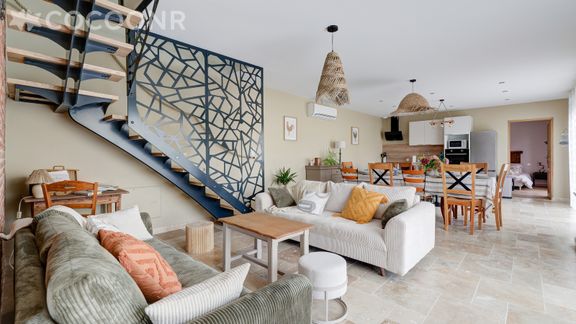 - Une pièce de vie de 45 m² avec canapés et espace repas