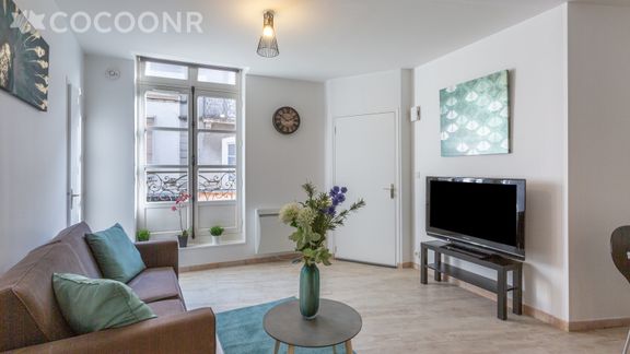 - Pièce de vie exposée Est avec espace salon (canapé convertible pour 2 personnes et TV), table à manger pour 4 personnes et cuisine entièrement équipée (four, micro-ondes, réfrigérateur, cafetière Senseo, etc). Vous bénéficiez d'un balcon donnant sur la rue Duguesclin, récemment rénovée, où vous trouverez tous types de commerces. Accès privatif et exclusif d'une petite terrasse au dessus avec possibilité de manger (table et chaises d'extérieur) et d'étendre son linge (étendoir).