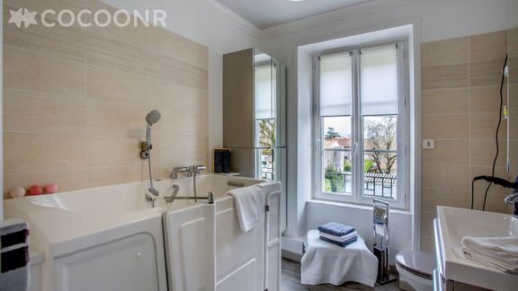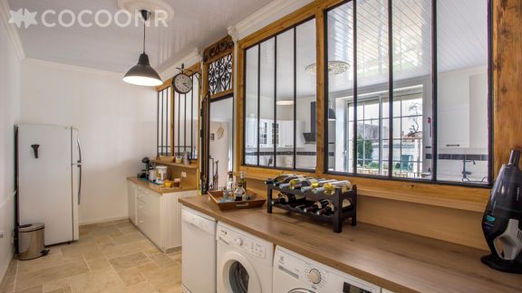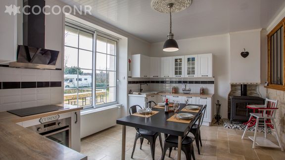 - Une cuisine équipée avec notamment : bouilloire électrique, four, four à micro-ondes, grille-pain, lave-vaisselle, plaques de cuisson et coin repas