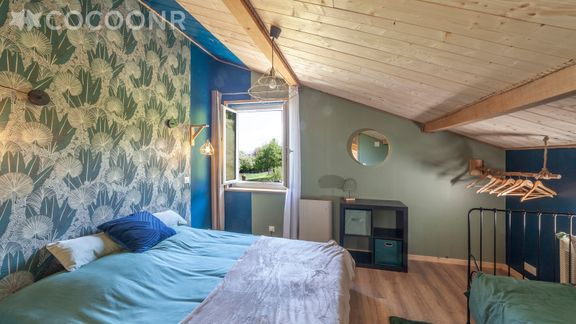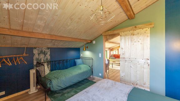 - Une chambre avec un lit queen-size (160×200) et un lit simple