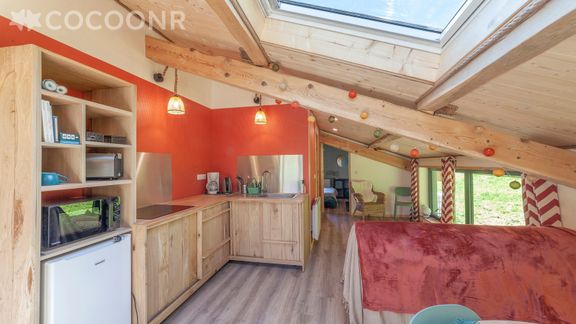 - Une pièce de vie de 23 m² avec coin repas, un coin nuit avec un canapé-lit double (160x200), et une cuisine ouverte équipée comprenant notamment : bouilloire électrique, four à micro-ondes, grille-pain, plaques de cuisson...
