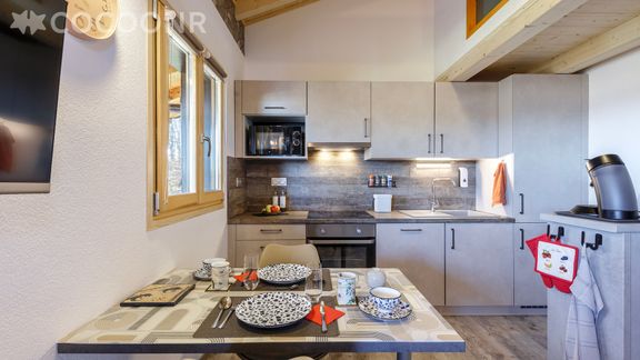 - Une cuisine équipée avec notamment : bouilloire électrique, four, four à micro-ondes, grille-pain, lave-vaisselle, plaques de cuisson, cafetière à dosettes Senseo...