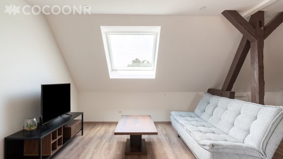 - Une pièce de vie de 36 m² ouverte sur la cuisine avec coin salon, TV, et un canapé-lit simple (130*190).