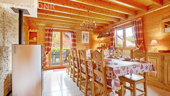 - Un coin salle à manger avec une grande table en bois (2 allonges) pouvant accueillir 10 personnes et 10 chaises en bois pour se réunir autour d'un bon repas.