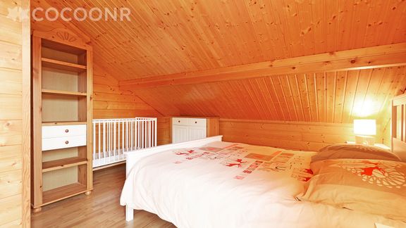 - Chambre 3 : un lit double (140x190), deux tables de nuit, un lit parapluie et une armoire penderie