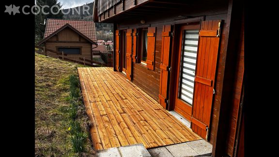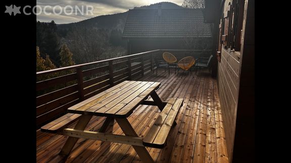Beau chalet au calme belle vue en hauteur avec vue sur la vallée proximité d’un lac à peine 10 minutes à pied avec beaucoup d’activités pédalo etc.Chalet bien équipé confortable parfait avec une belle et grande terrasse surpris de la terrasse la photo et pas à la hauteur elle fait petite alors qu’elle est grande.