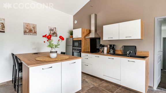 - Une grande pièce de vie de 50 m² avec TV, coin nuit avec canapé-lit, coin repas et une cuisine ouverte équipée avec notamment : bouilloire électrique, four, four à micro-ondes, grille-pain, lave-vaisselle, plaques de cuisson...